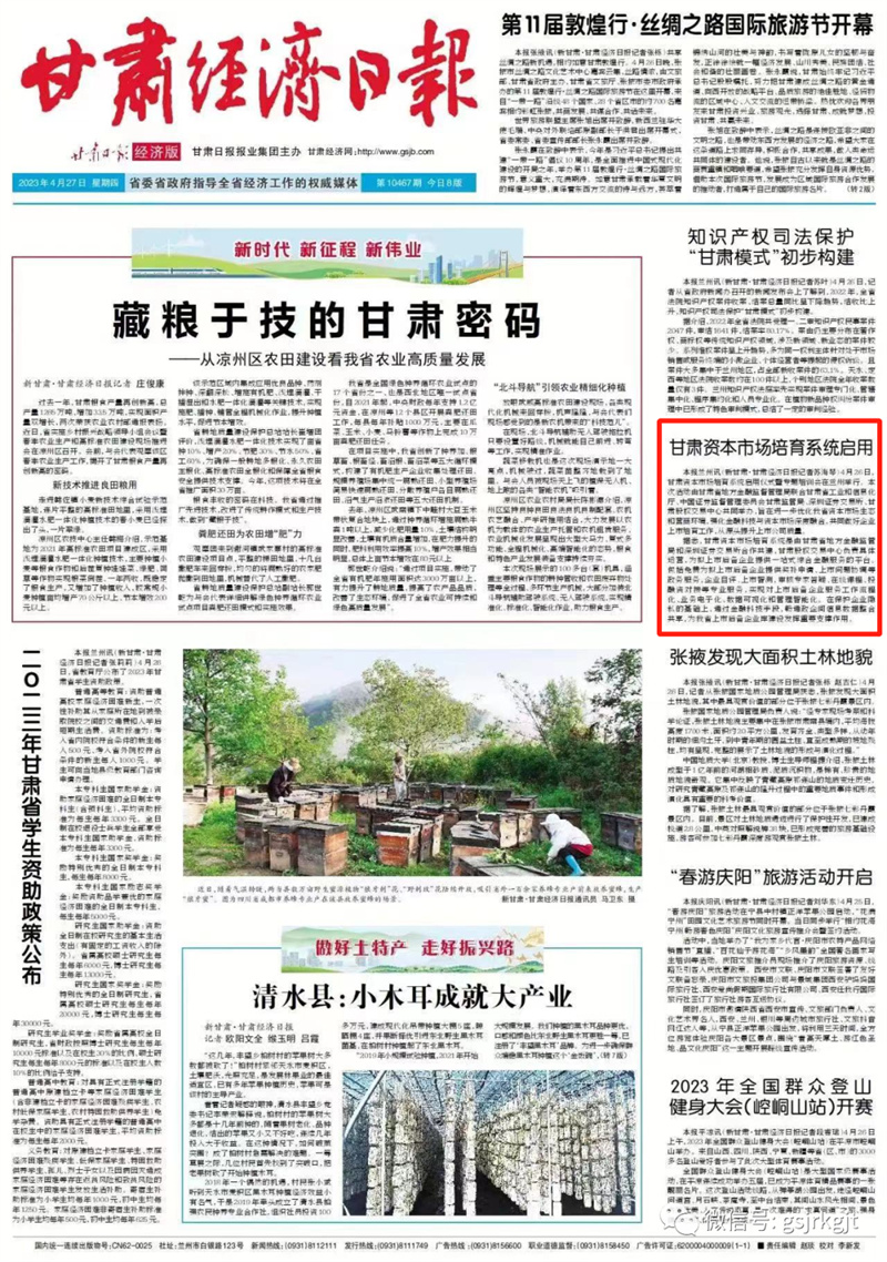 新甘肅客戶端蘭州訊(新甘肅·甘肅經濟日報記者 蘇海琴)4月26日,甘肅資本市場培育系統(tǒng)啟用儀式暨專題培訓會在蘭州舉行。本次活動由甘肅省地方金融監(jiān)督管理局聯(lián)合甘肅省工業(yè)和信息化廳、中國證券監(jiān)督管理委員會甘肅監(jiān)管局、深圳證券交易所、甘肅股權交易中心共同舉辦,旨在進一步優(yōu)化我省資本市場生態(tài)和營商環(huán)境,強化金融科技與資本市場深度融合,共同做好企業(yè)上市培育工作,從源頭提升上市公司質量。