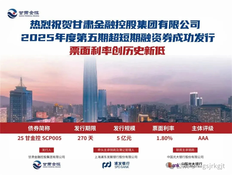 2025年11月17日,甘肅金控集團成功發行2025年度第五期超短期融資券,發行規模5億元,期限270天,票面利率1.8%,創下集團自開展債券融資業務以來所有債券品類中的歷史最低利率紀錄,融資成本管控成效顯著。此次低利率超短期融資券的成功發行,體現了資本市場對甘肅金控集團經營實力、信用資質及發展前景的高度認可,為其后續支持省內實體經濟發展、深化金融服務創新、防范化解金融風險等工作提供更充足的資金保障,助力集團在服務全省經濟社會高質量發展中發揮更大作用。