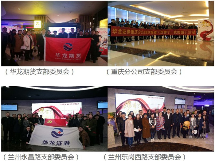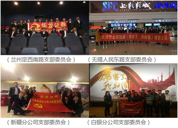 華龍證券股份有限公司黨委根據公司“兩學一做”學習教育制度和學習十九大精神系列活動計劃,認真安排部署,積極組織全體黨員、干部、員工開展《厲害了,我的國》主題黨日觀影活動,為每人購買2張影票,與家人朋友一同觀影。不僅豐富公司學習活動內容,提高精神素養,感受新時代祖國翻天覆地變化,同時傳遞正能量,增強企業凝聚力,激發昂揚斗志,鼓舞全體人員朝氣蓬勃邁向未來。