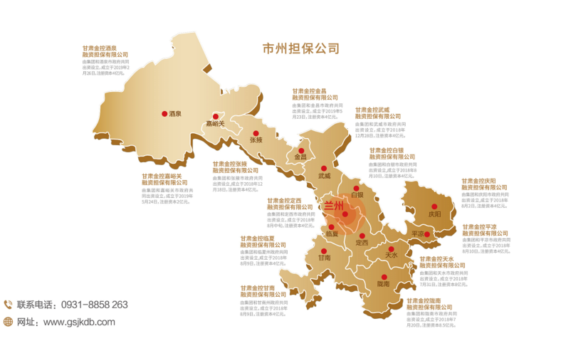 甘肅金控融資擔保集團股份有限公司(簡稱金控擔保)是由甘肅省財政廳出資,甘肅金融控股集團有限公司發(fā)起,經甘肅省地方金融管理局核準而設立的省級政府性融資擔保機構,甘肅省人民政府確定的省級融資再擔保機構,國家融資擔?;鸷灱s合作單位。連續(xù)四年資本市場主體信用AAA評級為穩(wěn)定,連續(xù)五年榮獲甘肅省“省長金融獎”,被評為甘肅省先進基層黨組織、省屬企業(yè)黨建融入生產經營典型創(chuàng)建示范點、“萬企興萬村”甘肅行動典型金融機構、首屆“甘肅社會責任企業(yè)”。